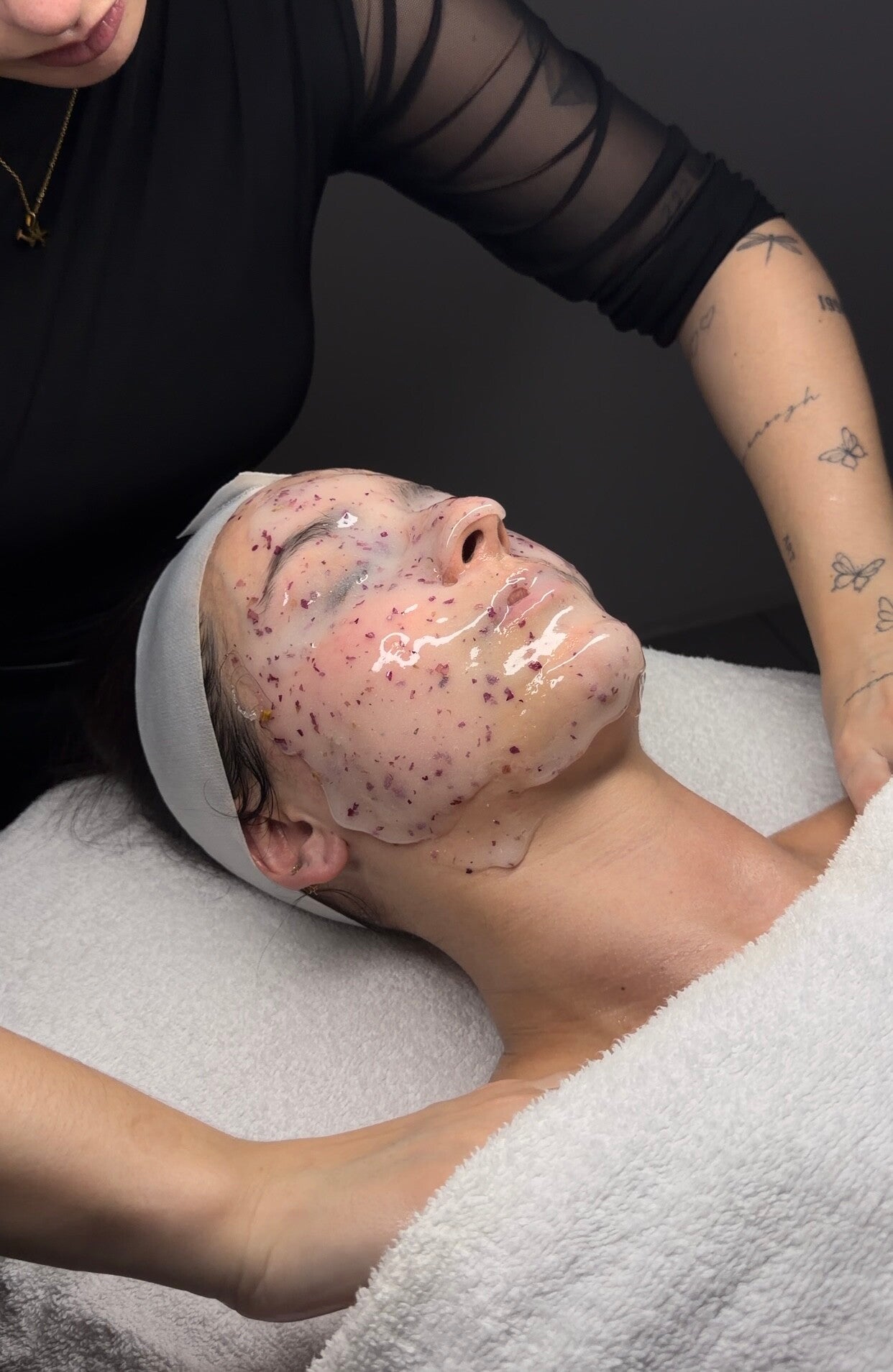 Daarna worden zuiverende en kalmerende werkstoffen aangebracht die ontstekingen helpen verminderen en de huid tot rust brengen.